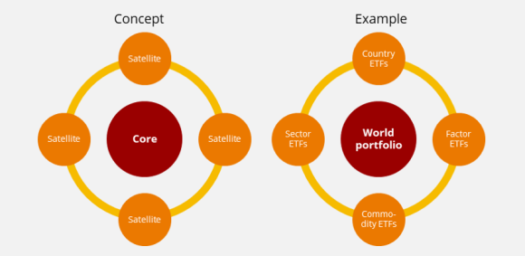 Core-Satellite investing is a best-of-both-worlds strategy that aims to increase performance and diversification while keeping costs and volatility low. The strategy is founded on two complementary components: the core and the satellites. Visually the strategy looks like a planet surrounded by its moons.